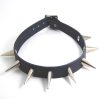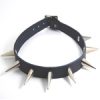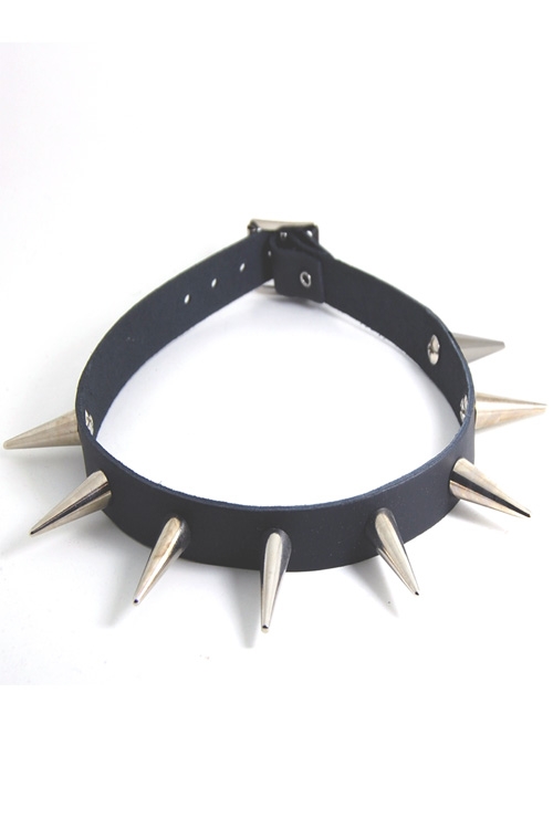 Black Leather Choker with 1 row of Smooth Nickle Plated Spikes, approx 30 mm tall.