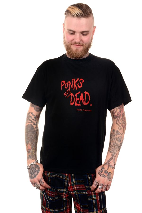 Black Mens Tee with Red Punks not Dead – Punk Forever print. Screen Print on a quality Mens T Shirt.