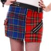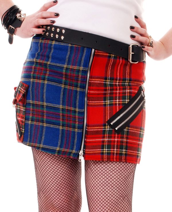Red and Blue woolly Tartan Bondage Split Skirt with Zips and Tiger Side Pocket.