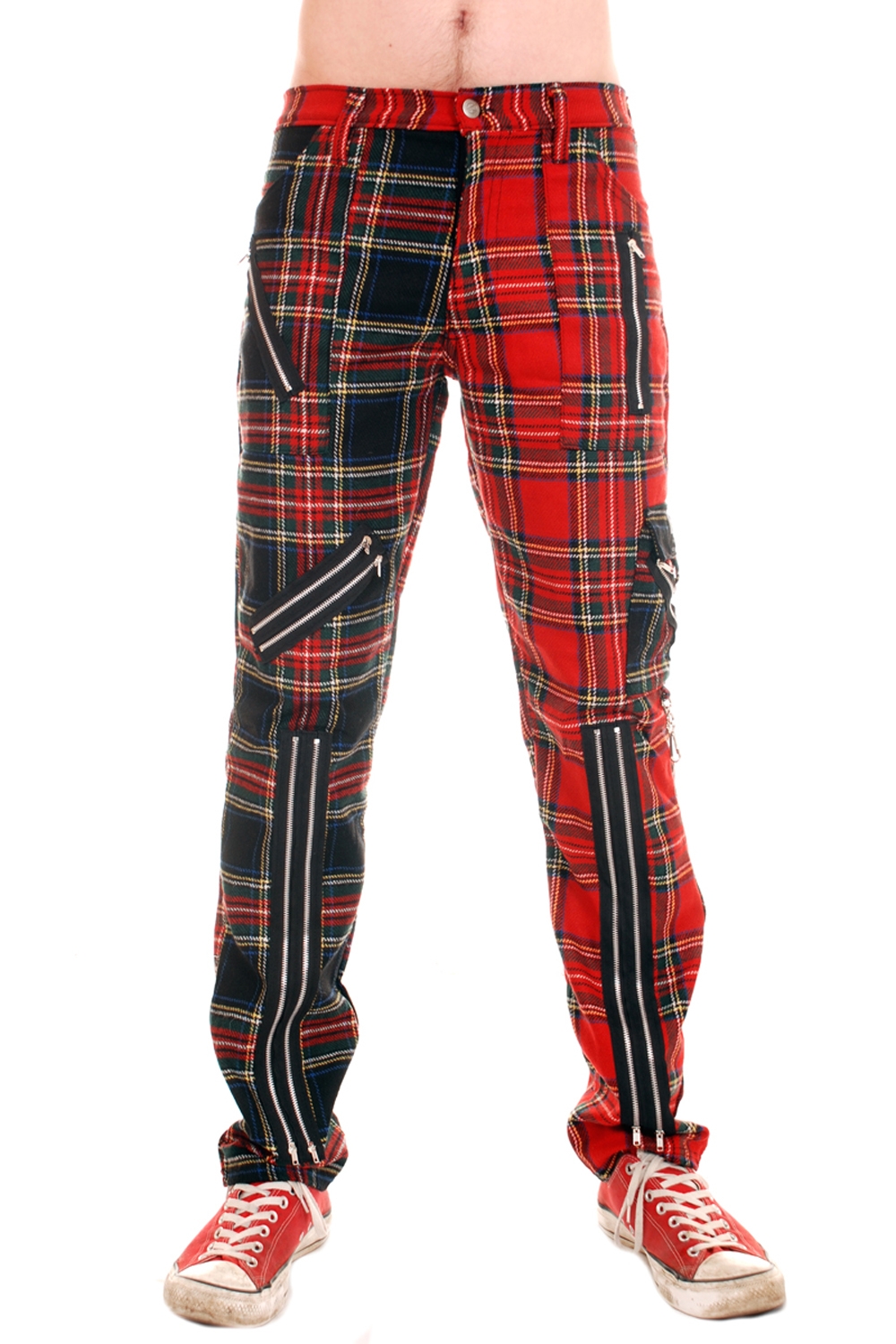 Red and Multi Zip Bondage Tartan Split Leg Pants.