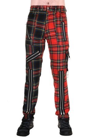 Red and Yellow Zip Bondage Tartan Split Leg Pants.