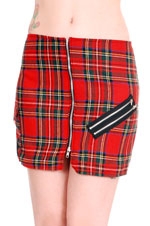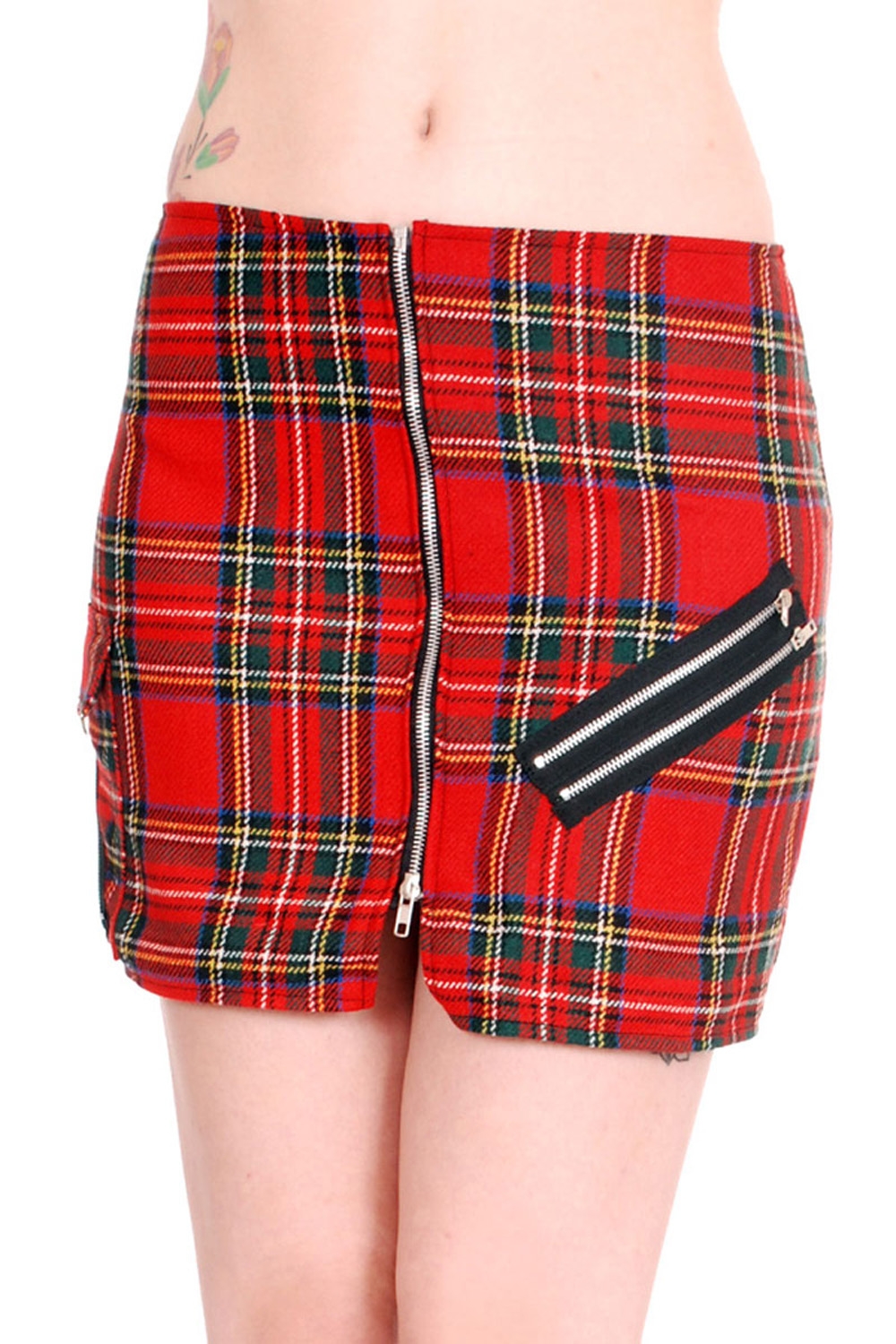 Red woolly Tartan Bondage Split Skirt with Zips and Pocket.