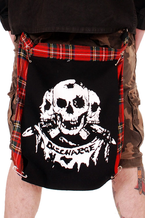 Tartan Bumflap with Discharge Three Skulls Print on a Black Cotton Panel.