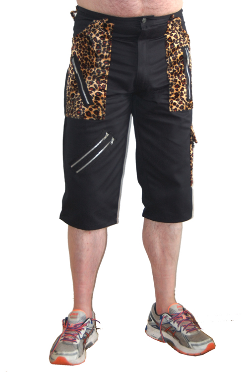 Black Cotton Bondage Shorts with Leopard fake fur trim on pockets and belt hoops.