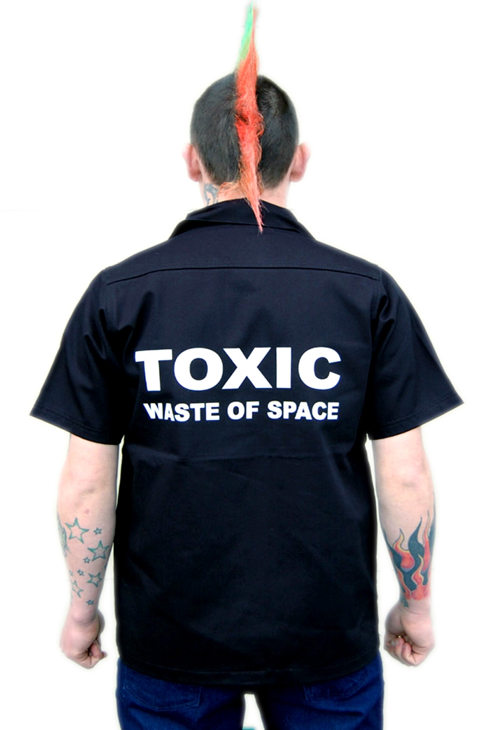 Black Cotton Work Shirt with Withe print on back – Toxic Waste of Space.